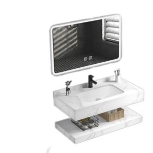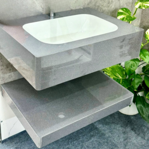 Mặt bàn đá trắng nhẵn mịn, chống thấm nước và dễ vệ sinh. Tủ bên dưới được làm từ vật liệu chống ẩm, chống mối mọt, bền bỉ theo thời gian.
